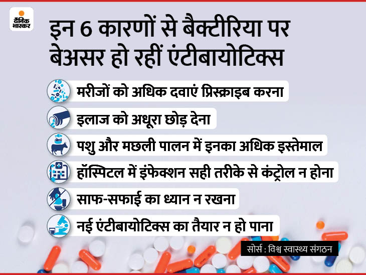 दुनियाभर में एंटीबायोटिक्स का बैक्टीरिया पर कम होता असर परेशान करने वाला है। 22 ग्रुप की 118 एंटीबायोटिक दवाएं चलन में हैं। जिनमें से 24 से ज्यादा दवाओं के प्रति बैक्टीरिया ने प्रतिरोधक क्षमता विकसित कर ली है। यानी ये दवाएं अब बेअसर हैं। एक्सपर्ट का कहना है, मॉलिक्यूलर टेस्ट के जरिए इसका तोड़ निकाला जा सकता है।